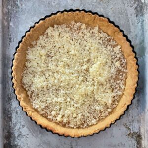 I find that if I’ve got the pastry just right, I can roll it out straight away and line my tart tin, without needing to rest it in the fridge first. I also trim the over-hanging pastry at this stage by gently rolling a rolling pin over the rim of the tart tin which will cut the excess pastry off and leave you with a neat edge. Pricking the base of the pastry all over with a fork at this stage which will prevent it ballooning up when cooked. If you skip resting the pastry before rolling it, it is essential to chill the lined tart tin for at least a couple of hours or even overnight before blind baking it.