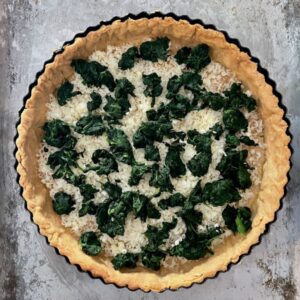 Next, you need to remove the baking beans and bake the tart for a further 10 minutes which will cook the base of the tart and ensure no soggy bottom! (For added security, brush the left-over egg white over the base of the pastry and cook for a further 5 minutes to seal it). If you have any cracks in the cooked pastry, carefully press bits of your left-over uncooked pastry to cover them up – no need to cook again as the raw pastry will cook when you bake the filled quiche.
