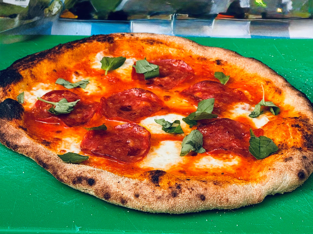 - Sprinkle some semolina on your work top, take a ball of dough and stretch it to a 10-12 inch round, pinching the edges to make a thicker rim. Sprinkle a pizza peel with a little more semolina and slide the pizza onto it. Spread a couple of spoonfuls of the tomato mix over the base. Top with you chosen ingredients (thinly sliced mozzarella, basil, salami, nduja, etc), then slide off the peel onto the pizza stone/into the pizza oven and cook for 7-10 minutes in the oven, 3-5 minutes in the pizza oven until cooked and crispy. Remove, drizzle with a little more olive oil and enjoy!