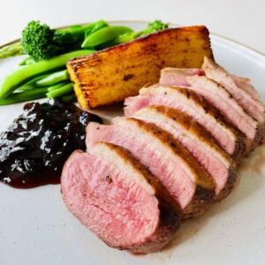 Seared duck breast with cherry sauce, gratin dauphinois, medley of green vegetables