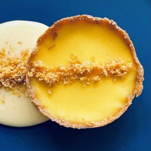 Individual passionfruit tartlet with lemon curd sauce and hazelnut praline